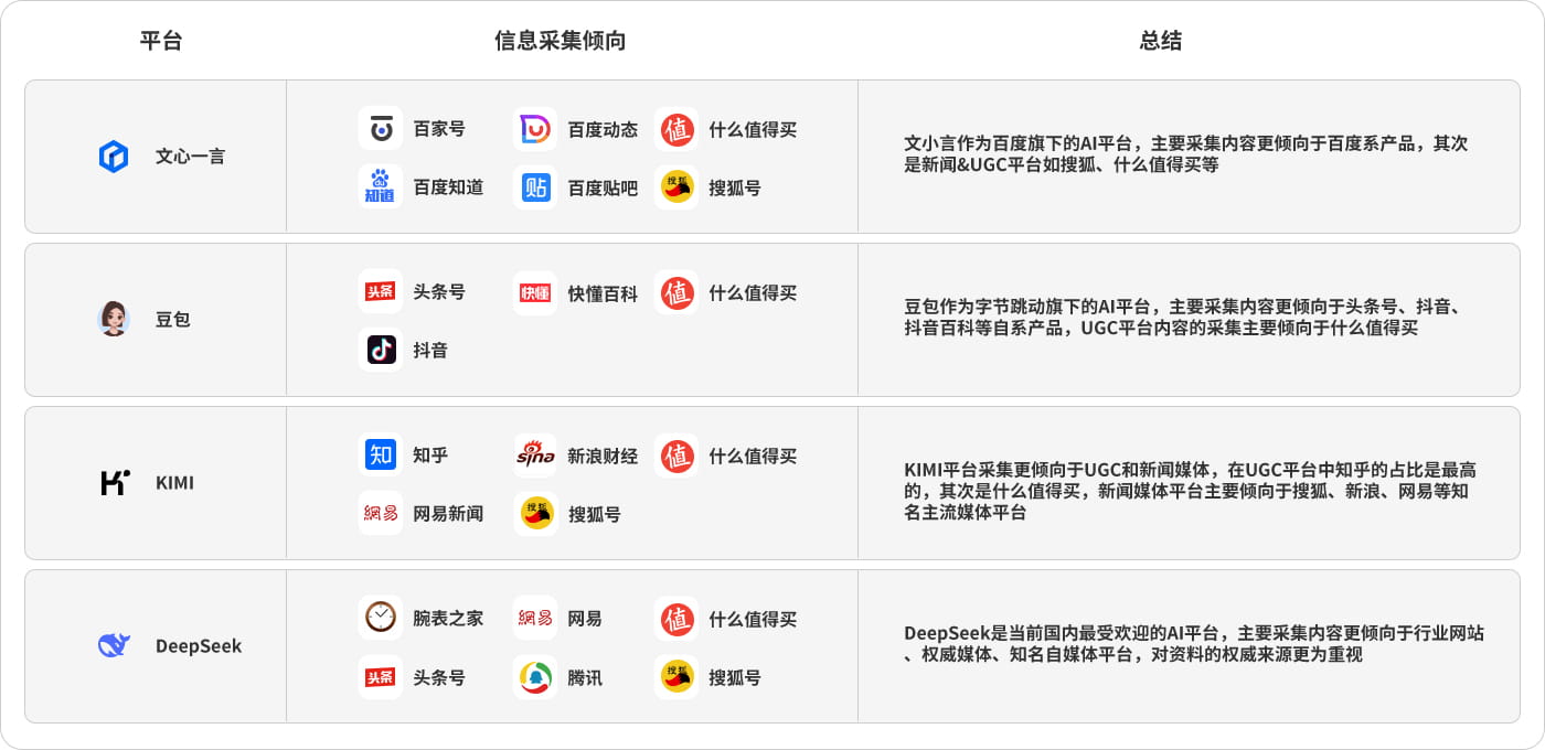 掌握 DeepSeek、ChatGPT、豆包、元宝、Kimi 等平台的采集逻辑与媒体偏好,进行精准渠道部署,显著提升语料采集率与曝光度。